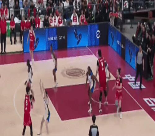 比赛开始:陈明伶跳球,球权给到张曼曼,中国队的第一次进攻被对手限制住。但是很快的,杨舒予一个快速突破,上篮拿分: