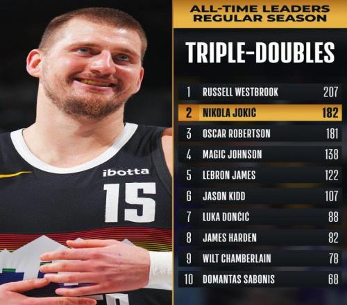 并且约基奇仅花费两节半时间就拿下三双,这样一来,约基奇生涯三双次数来到182次,正式超越大O奥斯卡罗伯特森独占NBA历史三双榜第二。