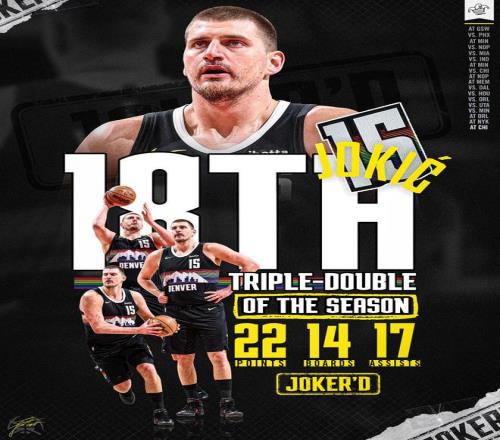 除了三双数升至历史第二之外,本场送出1次抢断后,约基奇还迎来生涯1000次抢断里程碑,单场送出4次封盖也创造个人赛季新高。