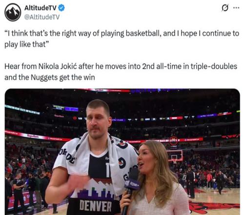 赛后谈到自己的三双数时,约基奇也坦言:“我认为这就是正确的篮球打法,希望能够继续这样打下去。”