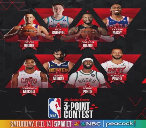 近日NBA官宣全明星三分大赛参加名单,分别有布克(太阳)、克尼佩尔(黄蜂)、利拉德(开拓者)、马克西(费城)、米切尔(骑士)、穆雷(掘金)、波蒂斯(雄鹿),以及鲍威尔(热火)。