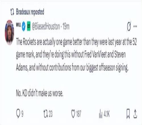 外界对37岁的杜兰特误解太多,实际上他场均36.7分钟联盟第三,他场均25.9分也是火箭得分最高,命中率51%、三分命中率40.4%,罚球命中率87.8%,他进攻效率120.5联盟第31,这样的杜兰特怎么会让火箭变得更糟?
