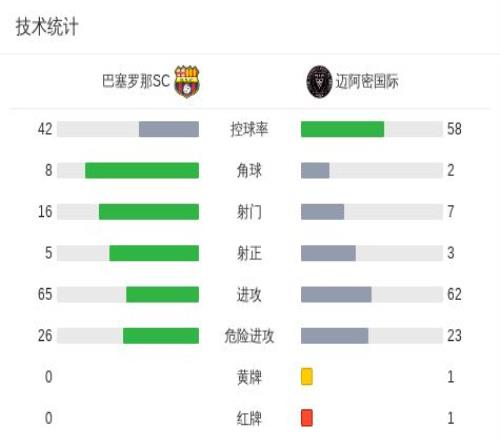 北京时间2月8日俱乐部友谊赛,巴塞罗那SC对阵迈阿密国际。上半场,梅西一条龙破门,之后对手由罗哈斯扳平,补时阶段梅西助攻贝尔泰拉梅再次领先。下半场,比赛尾声阶段阿亚拉染红,之后马丁内斯扳平比分。。最终比分巴塞罗那SC2-2迈阿密国际。