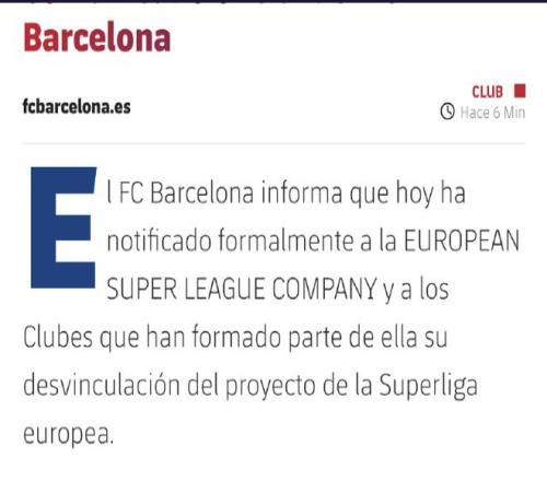 北京时间2月7日晚,西甲豪门巴塞罗那俱乐部官方发布声明:已向欧洲超级联赛公司及其参与组建俱乐部告知,即日起正式退出欧洲超级联赛项目。