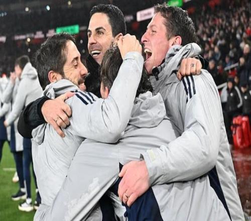 主帅阿尔特塔同样情绪激动,他与教练团队紧紧相拥,沉浸在执教阿森纳以来第二次闯入决赛的喜悦之中。