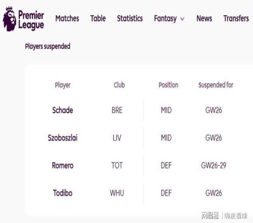 同样是红牌,热刺的罗梅罗就没有那么幸运了,英超官方信息显示,罗梅罗需要停赛四场,由于热刺足总杯出局,四个对手都是来自英超,分别是纽卡斯尔、阿森纳、富勒姆和水晶宫,刚好在客场挑战利物浦的时候,可以回归赛场。