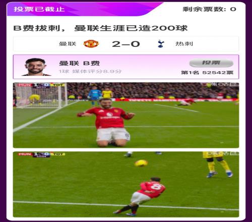 在曼联2-0热刺的比赛中,B费大师级表现串联全队,还打入关键进球,达成曼联生涯参与200球里程碑,率领红魔豪取4连胜,一记风骚插花脚更是引得吧友直呼“魔术师”!B费获得吧友52542票,高票当选【体育播报X咪咕体育英超第25轮最佳球员】!