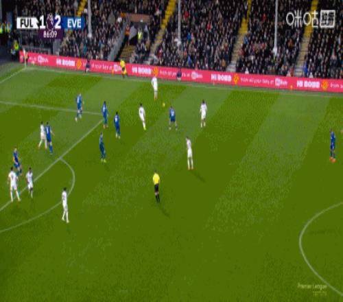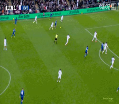 第75分钟,霍尔中路抢点,低射扳平比分,富勒姆1-1埃弗顿