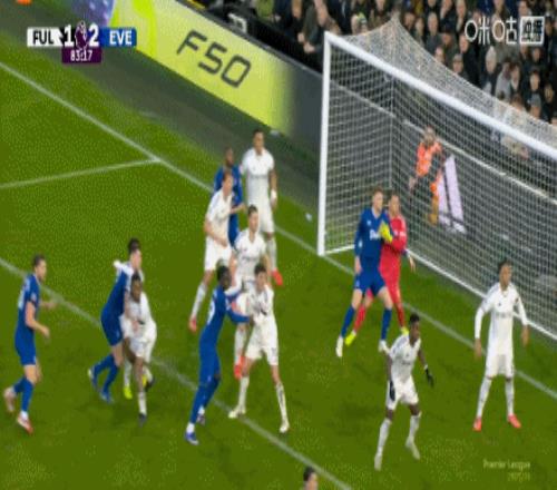 第82分钟,埃弗顿角球机会,莱诺自摆乌龙,富勒姆1-2埃弗顿